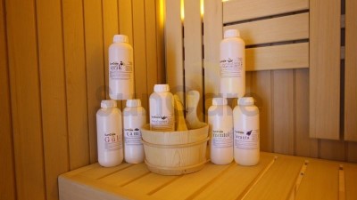 • Prepare your sauna essence by putting 1 lid scale of essential oil in 1 liter of water to your wooden or copper sauna barrel.