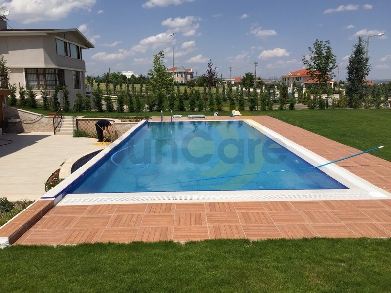 Finally, walking terrace (sunbathing area) is constructed around the pool. At this stage, skidproof materials should be preferred. These materials may be chosen among antislip ceramic, natural stones or wooden decks.