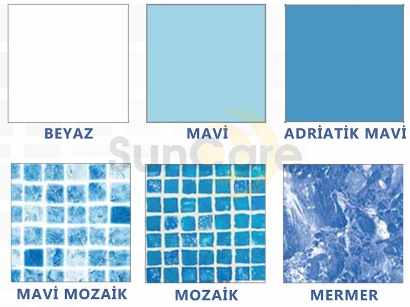 The main carrier material of prefabricated pond construction are steel panels. For this reason, such pools are also called panel pools. Our steel panels are produced as double layer protection as anti-corrosion and lacquer. Thus, it is used as the main carrier with the highest strength under the soil. Liner coating is applied on the main carrier. Liner; Providing 100% sealing; is a highly flexible, anti-bacterial material. The size you ordered is manufactured in one piece with machines in the factory. White, light blue, adriatic blue as well as single colors such as; There are different pattern options such as mosaic or marble.