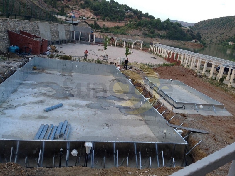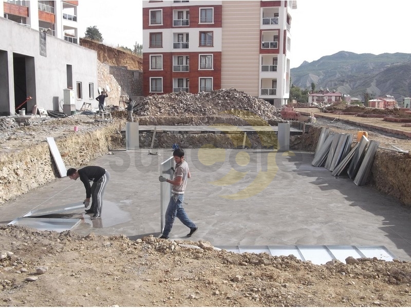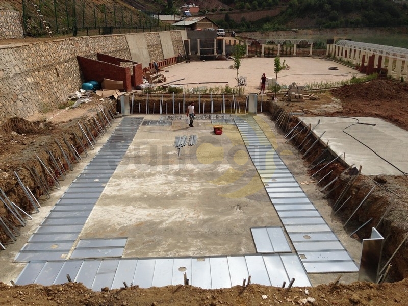 Liner can be implemented on ferro concrete blocs as well as steel panels for those who do not prefer to deal with concrete moulds. Construction with panel accelerates the process. It is more economic. After completing main concrete or panel structure, 4 mm of mat is lied on the ground. Than liner pool is lied inside the pool. The pool is being hung with liner rails which has installed due to the shape on the upper part of liner pool surrounding. The air between liner and min structure is being vacuumed. Following vacuum, the pool is filled with 15-20 cm of water. At this stage, equipment places are opened on the pool. Installation of the equipments are completed. The pool is completely filled with water. Necessary processes are undertaken for the first water and training on pool maintenance is delivered. The pool is delivered to the user.