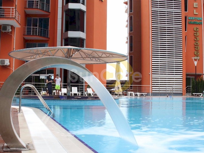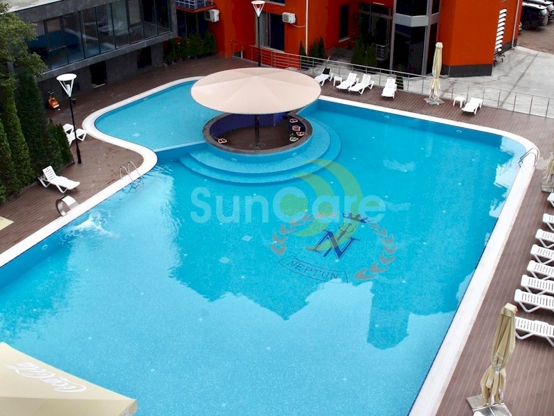 20 metre uzunlukta ve yaklaşık 240 m2 büyüklükte bulunan yüzme havuzu içerisinde pool bar ve çocuk havuzu bölümleri mevcut olup havuz tabanında Neptün Hotel logosunu uyguladık.