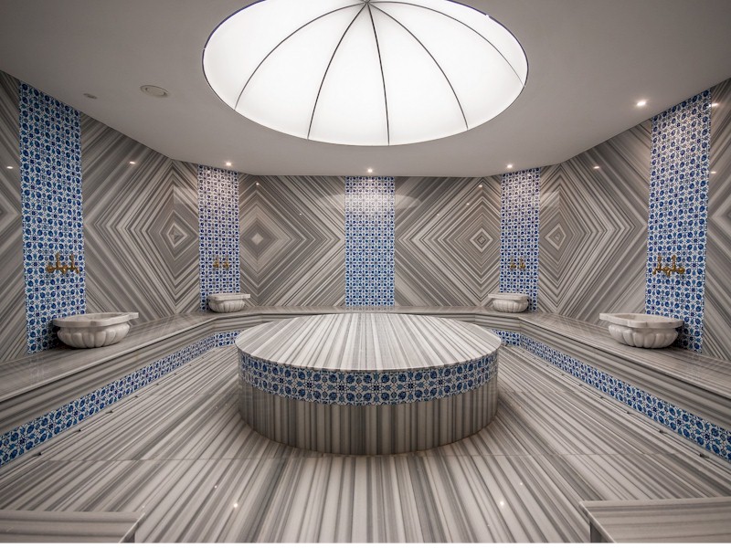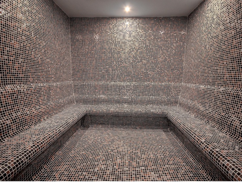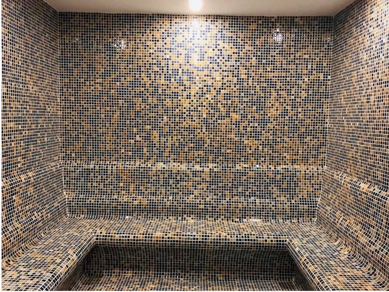 Buhar odasında Serapool marka %100 porselen ürünlerden oluşan 25mmx25mm ölçülerindeki özel kaplama ürünlerini kullandık. SunCare marka buhar jeneratörü ile devreye aldığımız spa bölümü kullanıcılarını ağırlamaya başladı bile!