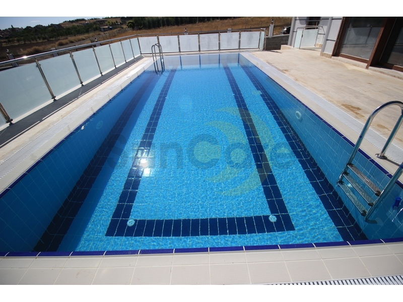 Açık havuzlar için %100 porselen malzemeden imal edilen Serapool havuz seramikleri kullanılan proje en sağlıklı filtrasyon yöntemi olan üstten taşma sistem uygulandı.